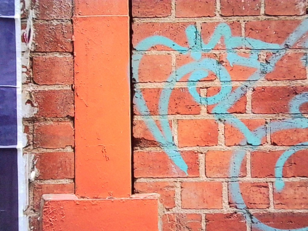 Brick wall with blue graffiti