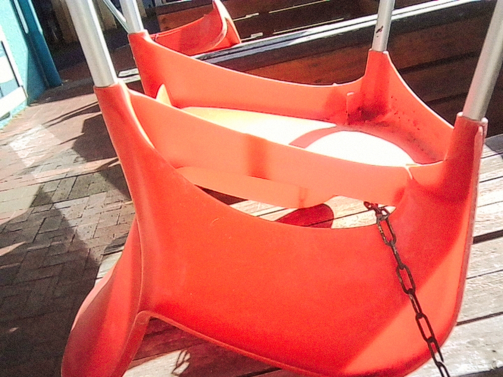 The glow of angled orange plastic at sunset, set against the wood and brick, with a hint of blue wall – an ordinary scene recorded by a distinctly ordinary toy camera.