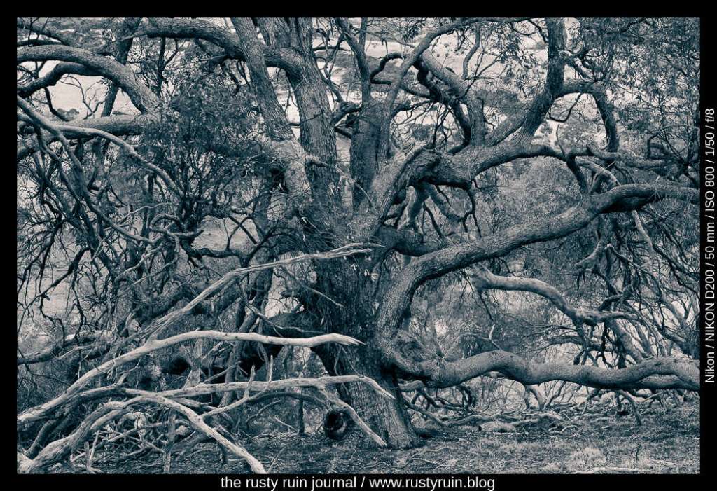 I don’t usually convert colour photos to black and white but sometimes it’s a good way to explore other qualities of an image. Black and white emphasises tonality, texture, and geometry. Just look at all of the twisting branches in the photo above. Even at ISO 800 in dull light, the Nikon D200 produces little noticeable noise. I didn’t bother to apply any noise reduction at all since the digital noise pattern is quite fine.